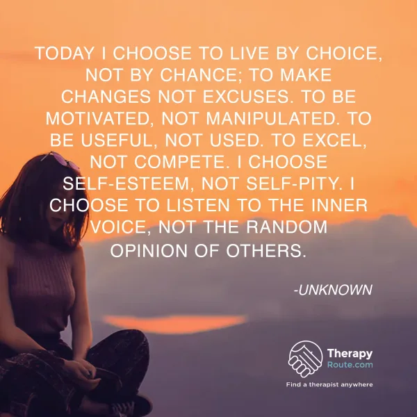 Today I choose to live by choice, not by chance, to make changes not excuses. To be motivated, not manipulated. To be useful, not used. To excel, not compete. I choose self-esteem, not self-pity. I choose to listen to the inner voice, not the random opinion of others. - Miranda Marrott