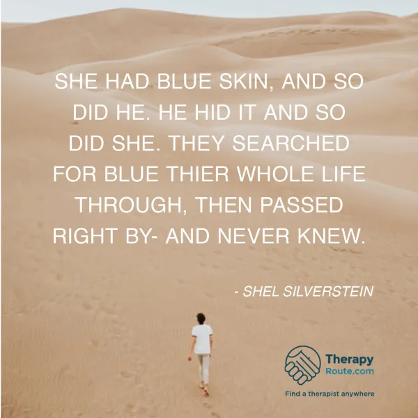 She had blue skin, and so did he. He hid it and so did she. They searched for blue their whole life through, then passed right by - and never knew. - Shel Silverstein