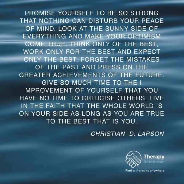 Promise yourself to be so strong that nothing can disturb your peace of mind. Look at the sunny side of everything and make your optimism come true. Think only of the best, work only for the best and expect only the best. Forget the mistakes of the past and press on the greater achievements of the future. Give so much time to the improvement of yourself that you have no time to criticise others. Live in the faith that the whole world is on your side as long as you are true to the best that is you. -Christian D. Larson